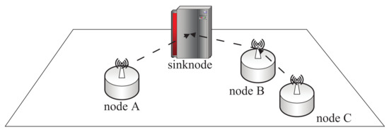 Figure 1 shows a schematic of a two-dimensional factory in the form of a single-cell scenario used in communication. The only sinknode performs the data aggregation. All the nodes in the factory need to report their data to the sinknode. There are two ways for a sensor to report: The first is to report directly to the sinknode, as node A. The second is node C in the figure, where data are transferred to the sinknode via node B (sometimes more than two hops). The task of the routing algorithm is to search a path to the sinknode for each sensor. Specifically, the routing algorithm needs to let the data of the sensor reach the sinknode directly (like node A), or reach the sinknode through the appropriate relay (like node C). In this paper, we define a successful communication need as an S N R as follows: