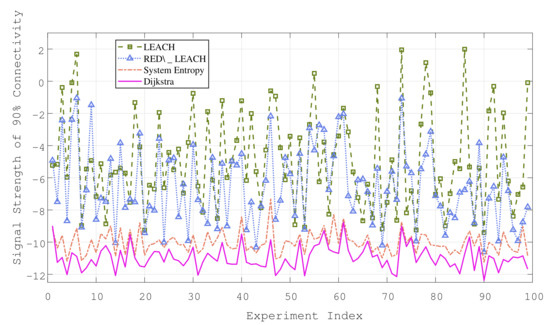 This section will introduce the experimental results about the system entropy routing method and mainly focuses on the power consumption. All the simulations in this paper are carried out in MATLAB 2020, and the random functions of the software are used to realize the scatter process described, the generation of white noise, and the generation of small-scale fading. The measurement of the network power consumption is described as follows: After the routing algorithm searches the path of the network, each sensor reports its data to the sinknode. Through a large number of simulations for the same routing scheme and in the same topology, the transmitting power is obtained under the premise of satisfying a certain successful connection rate. Obviously, the smaller the power is, the more reasonable the routing is and the lower the power consumption is. The required successful connection rate in this experiment is 0.9 (like the targeted outage probability in [14]). Once the routing algorithm has determined the network connection, all that remains is to generate a large number of small-scale random fading numbers to test the successful connection rate of the current network. By appropriately increasing or decreasing the transmitting power of the sensor, the average connectivity probability of the network converges to the required successful connection rate 0.9. The final successful connection rate P f error tolerated by the experiment is 0.0001, i.e., the final successful connection rate satisfies P f 0.9 0.0001 . In addition, the connection rate for each transmitting power comes from the average result of 10,000 independent Rayleigh fast fading h. The receiving sensitivity of a sensor is 2 dB. The noise power here is −104 dBm (thermal noise within 1 MHz bandwidth). In the experiment, the number of cluster heads is assumed to account for 50%. The network consists of 16 nodes and 1 sinknode. In addition, four slots are preset for LEACH and RED \ _ LEACH , which ensures the fairness.