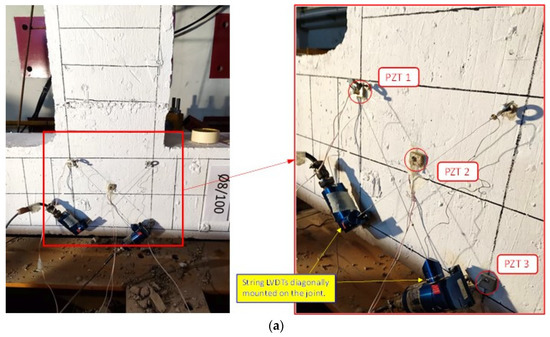 Before testing, three PZTs were bonded using epoxy adhesive on the concrete surface of specimen JC0 in the diagonal direction of the joint panel, as shown in Figure 5a. Three PZTs were also used in specimen JB0F; two PZTs were epoxy-bonded on the diagonal C-FRP ropes, and one on the concrete surface of the beam, as shown in Figure 6a.