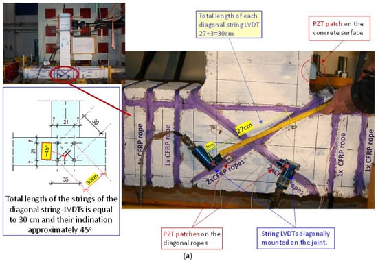 Further, we investigated the efficiency of the retrofitting technique using different types of transducers: (a) String linear variable displacement transducers (SLVDTs) diagonally mounted on the BCJ for the measurement of the shear deformations of the joint panel; (b) Strain gauges on internal steel reinforcing bars; (c) PZT sensors on the composite ropes and the concrete.