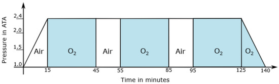 In humans, oxygen plays a crucial role in providing energy and sustaining life and functionality [1]. A variety of diseases and defects correlate with a lack of oxygen supply (hypoxia) that can lead to severe impairment and even death [2]. In the late eighteenth century, a therapy was developed, which counteracts the effects of hypoxia and decompression sickness: hyperbaric oxygen therapy (HBOT) [2]. The treatment involves the intake of pure oxygen under increased ambient pressure, hence the term hyperbaric, thereby increasing oxygen intake (hyperoxia) and enhancing oxygen tissue tension throughout the body. The therapy is now widely used in medical treatment of various maladies such as wound healing disorders, carbon monoxide poisoning, or decompression sickness [3,4] and the understanding of its working mechanisms continues to improve [2]. The duration and utilized pressure in HBOT depends on the diagnosis and intended therapeutic result. For the most prevalent application in the treatment of wound healing disorders, the standard parameters are HBOT given at 2.0 to 2.4 ATA for 90 minutes daily for 30 to 40 days [5,6,7,8].