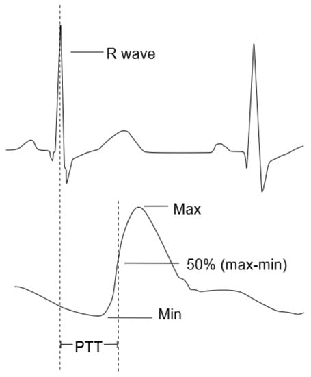The PTT is typically measured by detecting the time of the R-peak of an Electrocardiogram (ECG) as starting point, which is closely related to the opening of the aortic valve [17], and measuring the arrival of the pulse wave at a peripheral site, e.g., the finger, using a Photoplethysmogram (PPG) [19]. Figure 2 graphically illustrates the PTT as the time difference between the R-peak of the ECG signal and the inflection point of the PPG signal.