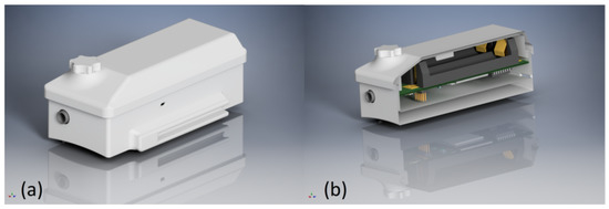 Housing of SPECTRE 3.0. (a) Exterior view of the device’s housing showing the assembled body and detachable lid and magnet holder. (b) Cross-section of the housing showing the placement of the PCB inside.