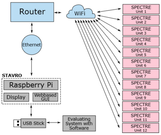Overall system topology consisting of twelve SPECTRE 3.0 measuring units, one control unit, a router, and a data evaluating system running on a PC.