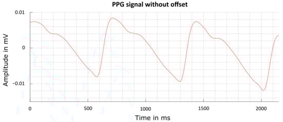 The PPG signal recorded with SPECTRE 3.0 is compared to the characteristics of a pulse wave described in the work of Lax et al. [25] according to which a characteristic pulse wave is comprised of an initial wave and a lower dicrotic wave. The initial wave reaches its peak “within 0.1 to 0.15 s of the start of the wave” [25]. The dicrotic wave generally appears “from 0.35 to 0.45 s after the start of the initial wave” [25]. Similar intervals for the specified time periods can be observed in the PPG signals recorded with SPECTRE 3.0 shown in Figure 10. SPECTRE 3.0’s PPG signals are therefore considered reliable for determining the PPG’s inflection point and consequently calculating the PTT.