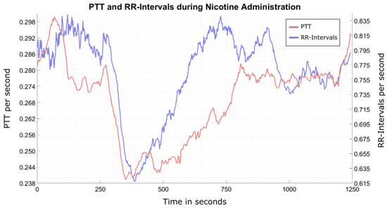 Effects of nicotine on the PTT. The data set recorded with SPECTRE 3.0 shows the PTT and R-to-R interval (heart rate) progression over time. Nicotine intake starts at 300 and ends at approximately 600 .