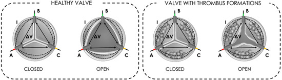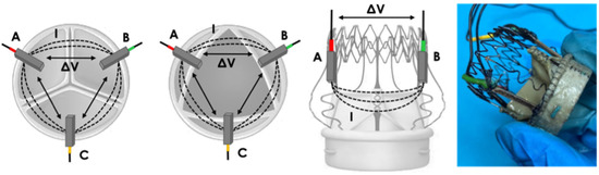 IVI measurement is based on embedding miniaturized electrodes in the structure of the BHV, which are used for the generation of a local electric field by injecting sub-threshold currents (I) between each pair of electrodes, and for the recording of potential differences (∆V) between those same electrodes. Following Ohm’s first law, the impedance measurement (IVI) is obtained as the ratio between the recorded ∆V over the injected I. Since the valve leaflets interfere with the local electric field lines during the valve opening and closing dynamics, IVI variations within the cardiac cycle (ΔIVI) reflect the cyclic movements of the valve leaflets. Thus, it is possible to correlate alterations of the IVI signal with alterations of the mobility of the valve leaflets which may occur in the presence of thrombus formations, as shown in Figure 1.