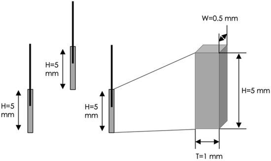 Prototype 1 involves small parallelepiped-shaped electrodes with the following dimensions: height H = 5 mm, width W = 1 mm and thickness T = 0.5 mm (Figure 2).