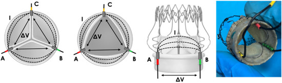 Three “proof-of-concept” sensorized BHVs were assembled and tested. Each prototype was made up of a commercial BHV currently used for surgical aortic valve replacement procedures (Perceval Aortic Valve, LivaNova PCL, London, UK), and was equipped with three electrodes, conventionally called “A”, “B” and “C”. The three electrodes are visually distinguishable from one another based on the color of the heat shrink which covers the electrode–wire interface: red for electrode “A”, green for electrode “B” and yellow for electrode “C”.