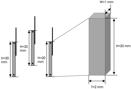 Prototype 2 involves parallelepiped-shaped electrodes with the following dimensions: height H = 20 mm, width W = 2 mm and thickness T = 1 mm (Figure 4).