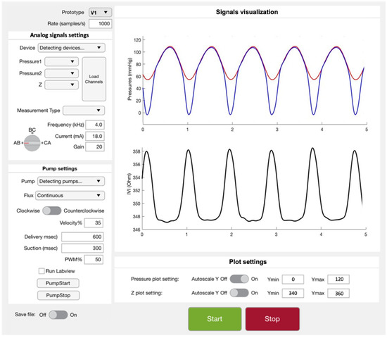 A Graphic User-Interface (GUI) was implemented in Matlab App-Designer (R2019a, MathWorks, Natick, MA, USA) to control the circulatory mock-loop platform during in vitro tests. The GUI is divided into the following different sections: one for the settings of the acquired analog signals (“Analog signals settings”), one for driving the pump (“Pump settings”) and one for the real-time visualization of the acquired signals (“Signal visualization”), as shown in Figure 9.