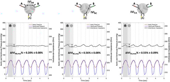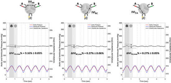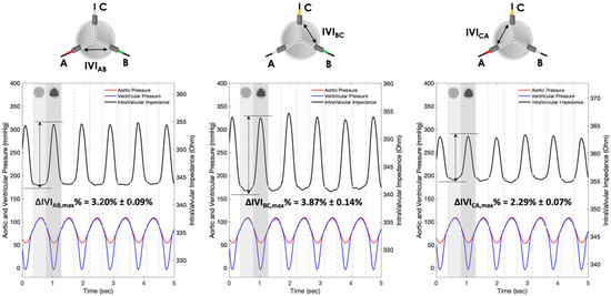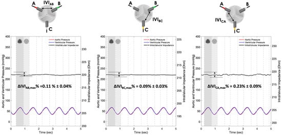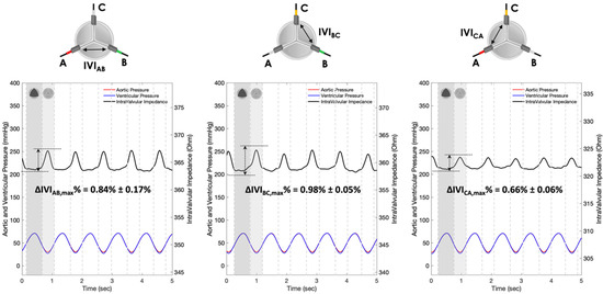 As in the physiological condition, the IVI signal profiles of Prototype 1 (Figure 13) reflect the opening/closing dynamics of the valve leaflets under altered conditions, with maximum values corresponding to complete valve closing and minimum values corresponding to complete valve opening. In particular, the maximum percent variation of the IVI module occurs in the electrode pair BC (), followed by AB () and CA ().
