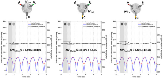The IVI signal profiles of Prototype 1 (Figure 10) reflect the opening/closing dynamics of the valve leaflets, with maximum values corresponding to complete valve closing and minimum values corresponding to complete valve opening. In particular, the maximum percent variation of the IVI module occurs in the electrode pair BC (), followed by AB () and CA ().