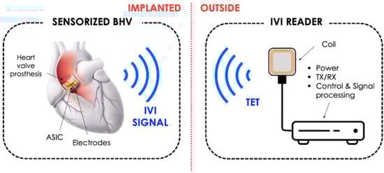 The sensorized BHV for IVI sensing will be equipped with a miniaturized Application-Specific Integrated Circuit (ASIC) and means for telemetric communication with the external electronic measurement unit (IVI reader) which powers and interrogates the implanted sensor system. The impedance measurement unit, which is currently represented by the external impedance-meter should be integrated within the ASIC. Therefore, the ASIC should include a current pulse generator, an electrode connection unit, a signal conditioning unit (amplification and filtering) and a TX-RX unit for signals transmission and receiving. The power supply of the implanted device will be guaranteed by the insertion of a dedicated coil for Transcutaneous Energy Transmission (TET) by inductive coupling with the external IVI reader. Surely, the location of both ASIC chip and micro coil for inductive coupling represents a critical point. Indeed, they should be located in a proper site of the valve prosthesis so as not to hinder in any way the natural movement of the valve leaflet. In this sense, a possible location to investigate for future development is the prosthesis valve ring.