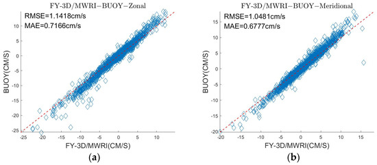 We compared the values of the sea ice velocity in the zonal and meridional directions, respectively, and the results are shown in Figure 6 and Figure 7, respectively. The scatter plot shows that although the distribution of the data was lightly fragmented, they were roughly distributed around the red dotted line. This distribution shows that the sea ice motion retrieved from FY-3D can roughly reflect the true state of sea ice motion in the Arctic region. The of retrieved sea ice motion ranged from 2.5713 cm/s to 5.3117 cm/s and the of retrieved sea ice motion ranged from 1.8389 cm/s to 4.0861 cm/s. The results show that directly applying the MCC method to passive microwave data cannot yield very accurate results of sea ice motion. The research of NSIDC also yielded errors in the sea ice motion retrieved from passive microwave data by using the MCC method. The of the sea ice motion retrieved from SSM/I on different components were, respectively, 4.16 cm/s and 4.23 cm/s [29].