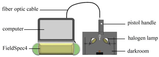 Figure 2. The device included a darkroom, a FieldSpec4 (with a spectrum acquisition range of 350–2500 nm and standard resolution of 1 nm), pistol handle, fiber optic cable, halogen lamp (50 W), and computer. The height and angle of the pistol handle were adjusted to avoid shadows and ensure that the sample was the only object to be measured in the field angle. The spectrum reference plate was collected at 30 min intervals to obtain the optimum signal-to-noise ratio of the spectrum data, and a black velvet cloth was used as the background in the darkroom.