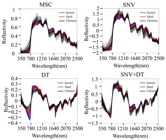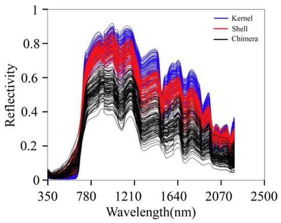 Figure 3 presents the original spectra of the samples. The blue, red, and black lines indicate the spectra of the kernel, shell, and chimera, respectively. The absorption peak intensities of the three sample types were significantly different. In the wavelength range of 750–2500 nm, the order of the overall relative reflectance values was as follows: kernel > shell > chimera. There are overlaps in the spectra of the three materials. The overlap is not conducive to model classification. Therefore, further preprocessing should be conducted.