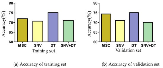 Figure 4 presents the model classification results of the different preprocessing methods. The DT preprocessing results were superior. The accuracy of the training sets reached 75.07%. The accuracy of the validation sets reached 75.09%. The results of MSC preprocessing were slightly poorer, and the results of the SNV and SNV + DT preprocessing were the poorest. DT was used as a preprocessing method.