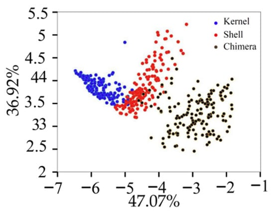 The Kennard stone (KS) method was used to divide the data set. The ratio of the training set to the validation set was set at 5:3. For the three samples of shell, kernel, and chimera, 250 samples were extracted as the training set, and 150 samples were extracted as the validation set. There were a total of 750 samples in the training set and 450 samples in the validation set. The wavelength collection interval of the FieldSpec4 spectrometer was 350–2500 nm, the original training set was a matrix with dimensions of 750 × 2151, and the validation set was a matrix with dimensions of 450 × 2151. Principal component analysis (PCA) was adopted to reduce the dimensionality of the data [