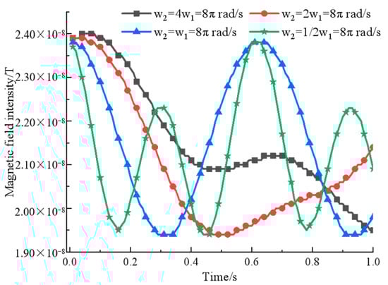 As can be seen from Figure 5, with the increase of the spacing, the magnetic field intensity measured continuously at the fixed-point decreases, and the signal characteristics continue to weaken, but the signal phase does not move and the waveform largely remains the same, so the change of the spacing has no effect on the phase information of the signal and has a greater impact on the propagation distance of the signal. In order to ensure the consistency of the simulation data and the physical measurement data, considering the size of the experimental field, the simulation is fixed with the permanent magnet spacing , and the rotation speed of only one of the permanent magnets is changed to obtain the relationship between the magnetic field strength and the rotation speed at the measurement point, as shown in Figure 6.