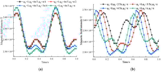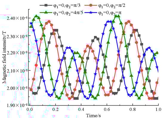 By analyzing the simulation results in Figure 7, we can know that with the increase of the initial angle of rotation , the magnetic field intensity tends to increase and then weaken. When , the peak value of the signal is the largest, and the difference between two adjacent great values is more obvious and characteristic. In summary, it can be concluded that the performance of the synthesized signal is better when the two permanent magnets are symmetrically distributed at an interval of 8m, and the rotation speed satisfies and the initial angle of rotation satisfies .