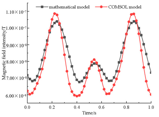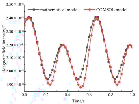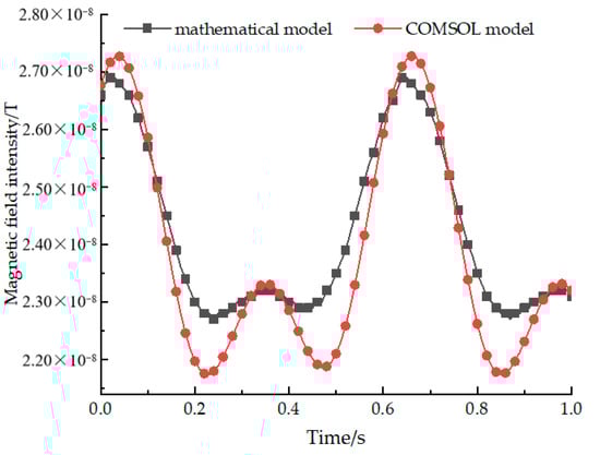 The optimized quadratic array structure parameters are input into the COMSOL software for modelling, and the magnetic field intensity is also collected at . The comparison of the magnetic field intensity between the mathematical model and COMSOL model is shown in Figure 16.