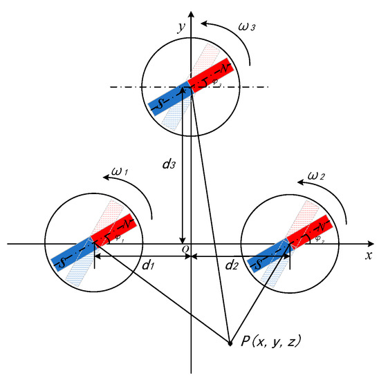 A binary array structure with good performance is obtained through simulation. On this basis, in order to make the signal intensity greater, the waveform more characteristic, and the phase information more easily extracted, a permanent magnet is added to form a ternary array structure, as shown in Figure 9. From the simulation data of the binary array structure, we can know that the spacing of the permanent magnets only has a large impact on the intensity of the signal and a small impact on the phase information, so on the basis of the binary array structure, the rotation speed and the initial angle of rotation of the permanent magnets are adjusted respectively. Three permanent magnets rotate in the XOY plane at angular velocities ,, at (−d1, 0), (d2, 0), and (0, d3), respectively, and measurement points are set outside the structure, where .