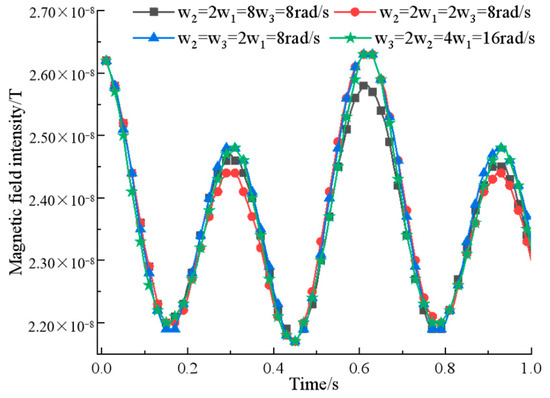 Comparing the ternary array structure and the quadratic array structure, it can be seen that after adding a permanent magnet, the signal change pattern corresponding to different rotational speeds is basically the same, and when , the intensity of the signal is relatively larger and the characteristics are more obvious. Via fixed structure spacing, rotation speed, and sequentially adjusting the rotation initial angle , , we get the magnetic field intensity change curve as shown in Figure 15.