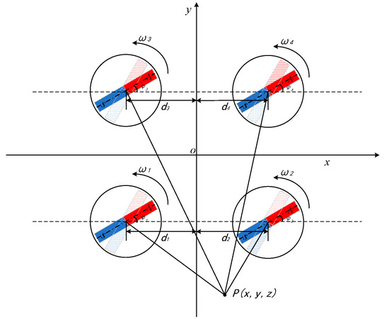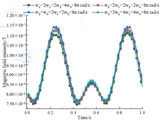 Based on the ternary array structure, we continue to add a permanent magnet and adjust the rotation speed and the initial angle of rotation of the permanent magnet, respectively. As shown in Figure 13, four permanent magnets are located in the XOY plane at (−d1, −d1), (d2, −d2), (−d3, d3), (d4, d4), rotating at angular velocities , , , , and with measurement points outside the structure, where .
