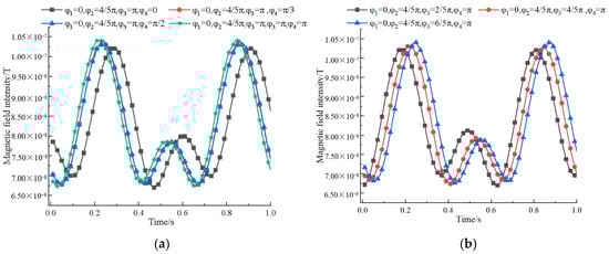 A comparison of quaternary array’s magnetic field intensity at different initial angles of rotation: (a) Changing the initial rotation angle ; (b) changing the initial rotation angle .