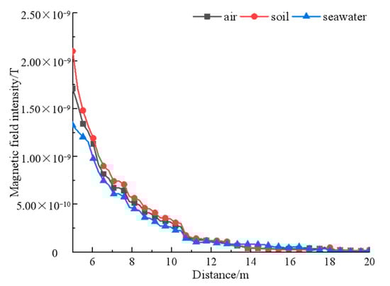 When changing the propagation medium, the magnetic signal intensity changes with distance in the same pattern, but due to the difference in relative permeability, the magnetic signal attenuation increases in seawater and decreases in soil, which is greatly related to the composition of the medium, but has little effect on the signal propagation trend, so the magnetic beacon structure proposed in this paper can play a stable effect in common media.