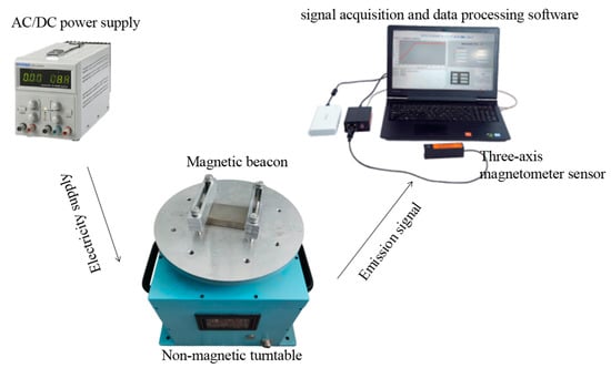 A measurement system platform is built in the laboratory, which consists of the following parts: a magnetic beacon, non-magnetic turntable, three-axis magnetometer sensor, AC/DC power supply, signal acquisition, and data processing software, etc., as shown in Figure 19.