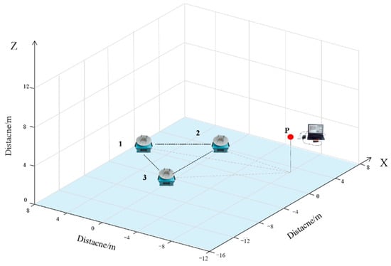 Next, the orientation experiment is performed. First, set up the magnetic beacon; as shown in Figure 25, the center of the array O is the center of the circle; then, set five test points in the radius of 8 m on the circumference: P1(,−4,3), P2(4,−,3), P3(0,8,3), P4(−4,−,3), P5(−,−4,3). The signal receiving and processing unit will be placed at these five test points in turn, after the turntable start and smooth rotation to start collecting magnetic signals.