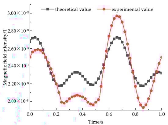 As shown in Figure 23, the magnetic signal is collected with a three-axis flux meter, and the waveform is stabilized and selected for plotting within 1s time. An error analysis of experimental and theoretical values is shown in Figure 24.
