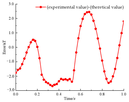 As can be seen from Figure 22, at the first maximum point, the experimental value is smaller than the theoretical value; at the second maximum point, the experimental value is larger than the theoretical value; and at the other extreme points, the experimental value is smaller than the theoretical value, and the maximum error is 2.71 nT. After arranging the experimental environment and instruments, the reasons for errors are summarized as follows: (1) By measuring the magnetic field intensity of each permanent magnet, it is found that the three permanent magnets are not completely consistent, and the magnetic value of the permanent magnet at position 3 is smaller than the theoretical value, while the magnetic value of the permanent magnet at position 1 and 2 is larger than the theoretical value. In the process of rotation, the speed of the permanent magnet at position 2 is twice that of the permanent magnet at position 1 and 3. Therefore, in the process of signal superposition, the signal is too large when it should be cancelled and too small when it should be enhanced; (2) the switches of the three turntables are not controlled at the same time, so there will be time deviation, which will lead to an error at the moment when the extreme point appears; (3) the time from start-up to stability of the turntable is different, so in the process of rotation, the initial rotation angle is not completely consistent with the theoretical value, which leads to the deviation of the magnetic field intensity at the corresponding moment of the extreme point; (4) the laboratory is not a non-magnetic environment. Because the indoor power supply mode is an alternating current, the interference magnetic field with variable intensity and frequency will also be generated, thus affecting the experimental results.