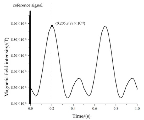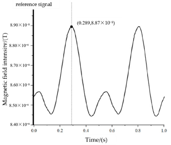 When the measurement point is at P4(−4,−,3), the maximum value of the magnetic signal needs to rotate through 210° from the positive half-axis of the Y-axis to the measurement point, corresponding to a time of 0.291 s, and the actual measurement results are shown in Figure 29.