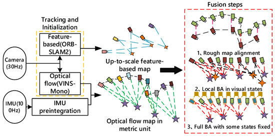 The specific implementation process is shown in Figure 1. Firstly, the initialization threads based on feature points and optical flow method are carried out in parallel. After the completion of the initialization of the two threads, the coarse alignment of the initial map is realized by using the Umeyama algorithm. Then, the local BA fusion of visual items is performed. Finally, the visual and inertial items in the two threads are fused to obtain the optimized initialization results.