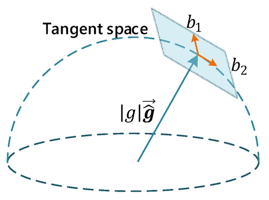 where is the known magnitude of the gravity, and is the unit vector representing the direction of gravity. Moreover, and are two orthogonal bases spanning the tangent plane, as shown in Figure 4 [8], and and are 2-D perturbation toward and , respectively. Lastly, and can be set arbitrarily as long as they are not parallel.