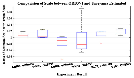 From the value of ratio, we can see that the scale estimated by Umeyama is relatively accurate compared with the actual value. To further verify, we compare the ratio value in Table 1 with the ratio value of the ORB-SLAM3 monocular inertial mode trajectory. The ratio value of ORB-SLAM3 is obtained by EVO (Python package for the evaluation of odometry and SLAM) [31]. As shown in Figure 7, the accuracy of the estimated scale is similar to ORB-SLAM3 or even better than ORB-SLAM3. ORB-SLAM3 as the state-of-the-art SLAM system is enough to prove the effect of Umeyama algorithm.