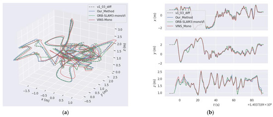 In order to show the trajectory comparison of the proposed method more intuitively, we take V1_03_difficult Sequence as an example. The trajectory comparison diagram is shown in Figure 9; (a) is the display of the trajectory in 3D space, and (b) is the error comparison in the XYZ axis. As can be seen from Figure 9, our proposed method is comparable to the monocular-inertial mode of ORB-SLAM3. There are some discontinuities in the trajectory because we only use inertial data in the initialization stage, and the combination algorithm with optical flow method and inertia has not been implemented in the subsequent tracking stage. Therefore, the subsequent trajectory is actually the trajectory after ORB-SLAM2 was scaled to metric unit, and its tracking process will be lost due to insufficient number of feature points, but it can continue to locate after relocation. The discontinuity of VINS-Mono is because the saved frame pose data is saved together with the key frames in ORB-SLAM2, so the discontinuity also occurs.