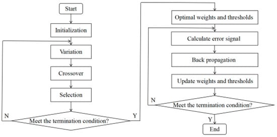 The initial weights and thresholds of the BP algorithm are randomly generated, and when the size of the dataset increases, they may fall into local minima during the training. An optimal solution search can be performed using the DE algorithm prior to initializing the parameters to enhance the ability of the BP algorithm to perform a global search. The flow of the temperature compensation algorithm proposed in this study is shown in Figure 1, and the steps are detailed below.