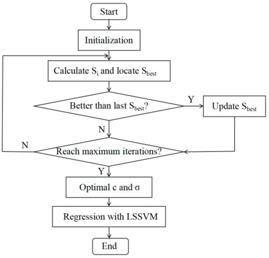 Based on the characteristics of the FOA, it can be combined with the least-squares support vector machine (LSSVM), which uses the output error signal to replace the relaxation variables and optimizes the inequality relations in the constraint conditions, converting them into equality relations in order to reduce the algorithm complexity and speed up the model solving speed. The flow of the temperature compensation algorithm is shown in Figure 3, and the steps are detailed below.