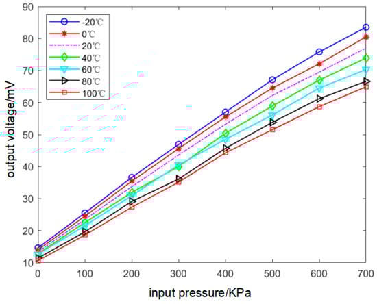The zero−drift coefficients and sensitivity temperature coefficients of the three sensors are listed in Table 4. Sensor B had the best calibration data performance, whereas Sensor C had the worst performance, which can be attributed to the fact that the sensor die has been compensated in the hardware. However, the different models have different compensation accuracies, which in turn leads to a difference in the calibration data. The drift coefficients of the output voltages of the different sensors were large, which demonstrates the necessity for software compensation.
