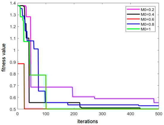 It can be found that when the population is in the early stage of evolution, the probability of variation tends to 3M0, which increases the population diversity. When the individuals in the population evolve to a later stage, the probability of variation decreases to M0, which is conducive to the retention of the optimal solution. In this study, experimental investigations were performed for the value of M0. It takes the value interval of [0, 1], and the step size is 0.2. The performance results of the algorithm for different M0 values are shown in Figure 7. From the figure, it can be observed that when M0 was 0.6, the algorithm had the highest optimal solution search efficiency. Therefore, M0 was set to 0.6.