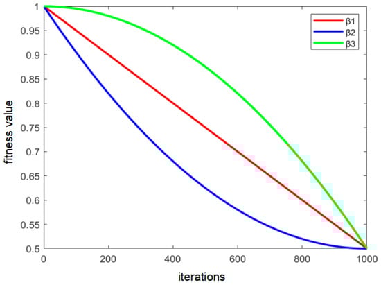 In the solution result of QPSO, the shrinkage factor is used. If it is a constant value, the global optimal solution may be missed in the later stage of the iteration, reducing the convergence speed of the algorithm. Therefore, it can be defined as a decreasing function to make the algorithm easier to converge in the later stage. In this paper, three definitions were adopted to define the decreasing function [35,36], which can be expressed as