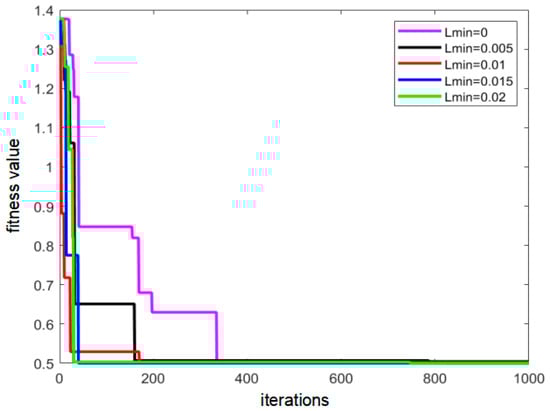 This paper conducted an experimental study on the value of Lmin, which varied from 0 to 0.02 under a step of 0.005. The performance results of the algorithm for different Lmin values are shown in Figure 9. It can be seen that the optimal solution search efficiency of the algorithm was the lowest when Lmin was 0, and the optimal solution search efficiency of the algorithm was the highest when Lmin was 0.02. Therefore, Lmin was set to 0.02.