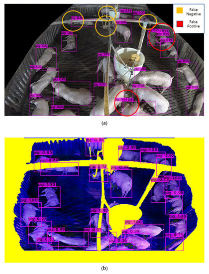 As pig pen environments exhibit significant differences, an effective deep learning model should achieve sufficient accuracy for different pig pen. To evaluate our proposed method’s robustness, we tested all models on pig pen images taken from the Chungbuk National University. The pig pen comprised a 4.9 m × 2.0 m × 3.2 m tall pigsty. To obtain the images, we installed an Intel RealSense camera (D435 model, Intel, Santa Clara, CA, USA) [47] on the ceiling. Table 6 and Table 7 present a detection accuracy comparison on training from the Hadong dataset and testing on the Chungbuk dataset. Although latter environment did not feature significantly occluding feeding facilities, deep learning models trained from the Hadong dataset still showed decreased object detection accuracy for the Chungbuk dataset. Compared to the baseline model, however, the proposed method could increase the detection accuracy up to 15% (from 75.86% to 90.25% with tinyYOLOv4, from 63.15% to 77.76% with tinyYOLOv7), thus showing the proposed method’s robustness on other pig pen environment. Each detection cases for Chungbuk test dataset shows improvement, but not all cases are solved as shown as Figure 15.
