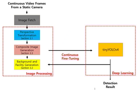 The proposed composite image framework enables tinyYOLOv4 to efficiently learn features of pigs occluded by facilities, thus increasing the detection accuracy of all pigs regardless of occlusion. Figure 2 illustrates the overall structure of the proposed method; wherein composite images are generated to minimize false-negative and false-positive errors. The figure shows that this method continuously improves the accuracy of image processing and deep learning.