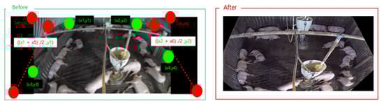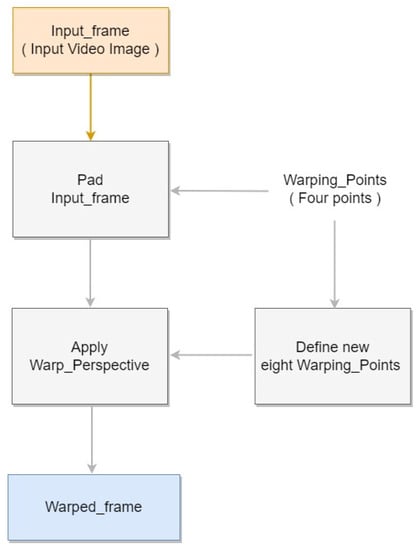 One obstacle that hinders accurate object detection is the differences in size of target objects owing to distance from the camera. To mitigate this issue, we incorporated an automatic perspective transformation. The warp perspective transformation method [43], an image processing method, deforms the input pixel grid to fit the output pixel grid by changing the sizes of pixels within. With this process, the object detection difficulty due to differences in pig sizes was alleviated. To establish the transformation points, we applied our automatic perspective transform method. First, we calculated the slopes of the warping points on either side. We then padded the intersection points between the slope and the top and bottom edges, where the original image’s resolution is exceeded. These locations were used to select new warping points. Finally, perspective transformation was ap-plied to the eight new warping points to generate a new transformed image. The result is shown in Figure 3, and Figure 4 shows the block diagram corresponding to the Perspective Transformation.