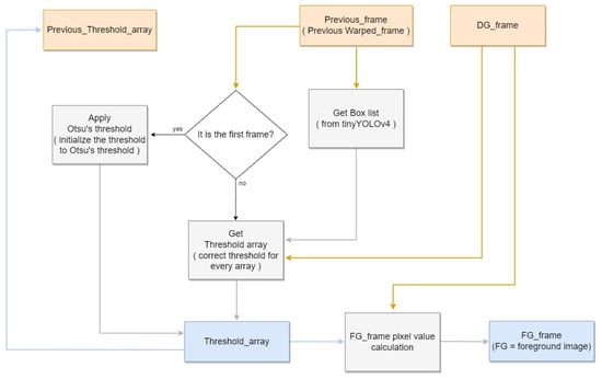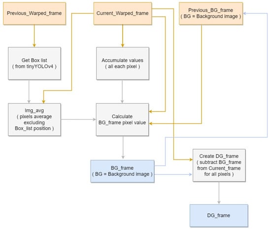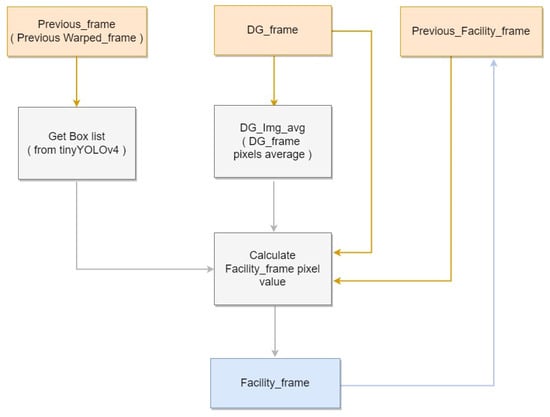 Subsequently, pixels that continuously appear within detected boxes are classified as not affecting the background and are substituted with the current frame’s average pixel. However, as the actual background does not remain fixed, the background image needs to be gradually updated according to each subsequent frame. To settle the issue, each pixel on current frame, excluding the detection box region, is compared with previous frame’s each pixel. If current frame’s pixel is higher than previous frame’s pixel on the same location, then background’s pixel is raised by one, otherwise if less, lowered by one. With long period of frames, background image can be generated by using tinyYOLOv4 detection result using video data that contains pig objects. Finally, we generate the difference image by calculating difference between pixel on current frame image and current frame’s background image. The image is necessary to use on facility image generation module to identify the location of foreground on pig object. Figure 5 shows the block diagram corresponding to the Background Generation.